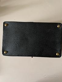Chiusura metallica dorata a scatto girevole, cuciture minute e leggere irregolarità che testimoniano la lavorazione manuale.