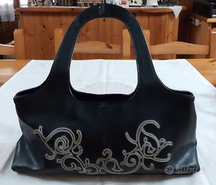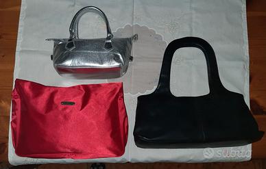 Di seconda mano in ottimo stato. per tutte tre assieme euro 20,00. anni 90/2000 - borsetta mini bag LONDON GLAM, color argento, mai usata ma presenta piccolo graffio nel fondo, taschina interna. larghezza cm25 - fondo cm20xcm8 - h.cm13, con manici cm25 circa. euro 9,00 - borsetta baguette nera in similpelle con ricami davanti in bianco, taschina interna con cerniera. larghezza cm36 - fondo cm39xcm9 - h.cm17, con manici cm38,5. euro 9,00 - pochette oppure beauty case della ZIPPO, in raso/satin rosso vivo, con cerniera sotto il risvolto, pieghe sul davanti e profilatura su tutto il bordo. larghezza sotto cm38, sopra cm34 - profondita' cm4 - h.cm25. euro 9,00 preferibile ritiro a mano, eventuale spedizione con corriere.