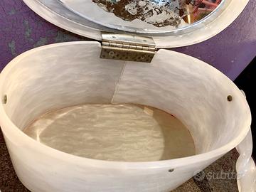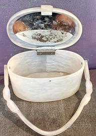 Vendo borsetta ovale U.S.A anni 50 in lucite madreperlata bianca e coperchio rivestito di conchiglie a rilievo ed effetto sabbia.
