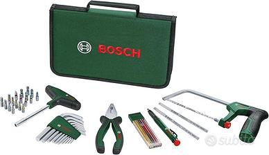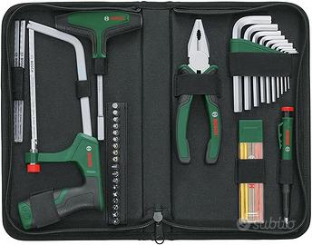 Contenuto della confezione: 1 x seghetto da 150 mm (1 600 A02 ZA7), 1 x pinza universale da 180 mm (1 600 A03 2VB), 1 x cacciavite per bit con impugnatura a T (1 600 A02 Z9U), 1 x matita per fori profondi (1 600 A03 2V2), 10 x chiavi a brugola (1,5, 2, 2,5, 3, 4, 5, 5,5, 6, 8, 10 mm), 2 x lame per seghetto da 150 mm, 24 TPI (1 600 A03 2UL), 18 bit (PH1/2/3, PZ1/2/3, SL4/5/6, TX10/15/20/25/30, HEX3/4/5/6), 6 x mine multicolore (1 600 A03 2UV), 1 x borsa in tessuto con cerniera