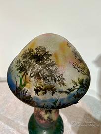 Importante lampada a fungo a firma Daum Nancy , in pasta di vetro trattata alle polveri ossidanti , decorata a cammeo e dipinta a freddo a smalto, di gusto art nouveau.