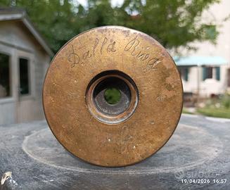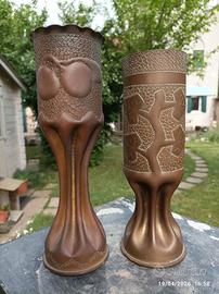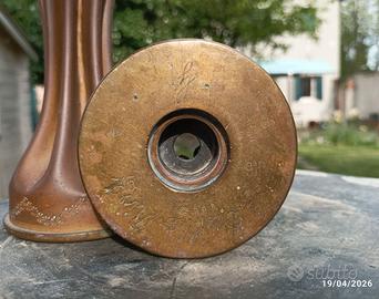 Bossolo in ottone per munizione di artiglieria da 75, lavorato in trincea da un soldato nella Prima Guerra Mondiale, per ottenere un vaso da fiori in stile Liberty. Sul fondo è inciso il cognome dell'autore: G. Dalla Riva. Ovviamente inerte, non contiene carica e innesco. Punzonatura: 15 - 916 - SMI - FP cerchiato - parziale stemma sabaudo. Diametro cilindro 75mm, fondello 90mm, altezza 25cm circa, peso Kg 1,110. Provenienza: Altopiano di Asiago (Vicenza). Oggetto visionabile senza impegno a Due Carrare (Padova). Altro bossolo simile disponibile allo stesso prezzo, vedi l'ultima foto. Per info: Roberto +393343205320.