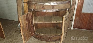 Disponibile armadio/tavolo portabottiglie realizzato artigianalmente da un botte ovale ,di grandi dimensioni , 2 ante e ripiano interno ,ferramenta in ferro battuto ,altezza 102 cm, larghezza 104 cm,profondita' 65 cm peso circa 100 kg ,ideale per allestimento vetrine ,arredare taverne e cantine ,pub ,prezzo trattabile ,altre foto a richiesta