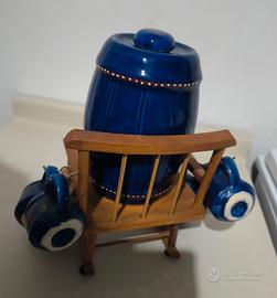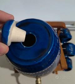 Set decorativo composto da una botte in ceramica blu con un rubinetto e sei tazzine vintage