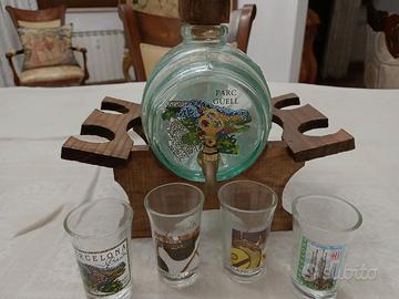 Botticella in vetro operato con decorazioni, rubinetto in ottone, chiusura con tappo in legno, supporto in legno, 4 bicchierini coordinati in vetro. Come nuovo. Perfetto come idea regalo o per arredare una taverna, tinello, cucina e salotto. Consegna a mano a Roma in zona Eur fonte meravigliosa oppure spedizione con tutto subito
