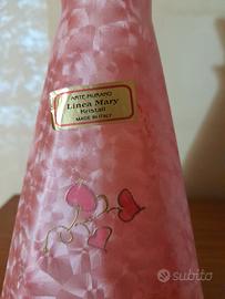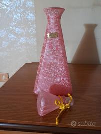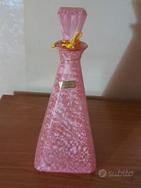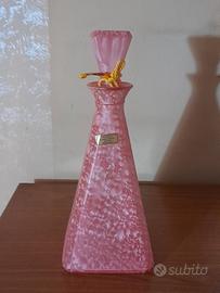 Elegante bottiglia con tappo anni 80 in vetro murano fatta a mano , di colore rosa tamponato nella parte centrale dei fiori a forma di cuore con perfilo in oro tutta integra e nuova misura altezza 30 cm base inferiore 12 cm