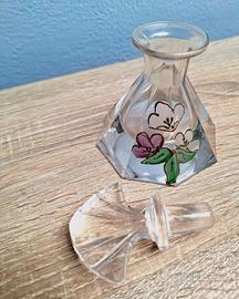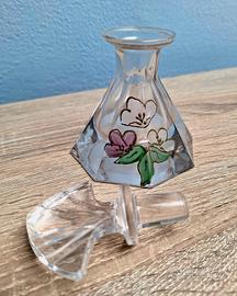 Bottiglia ART DECÒ di profumo del 1950 in vetro con decorazioni floreali e tappo a ventaglio intagliato