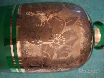 Elegante vetro di Boemia dei primi del '900 a superficie in parte trasparente, in parte opaca caratterizzato da ampia fascia in foglia d'oro decorata a motivi floreali.