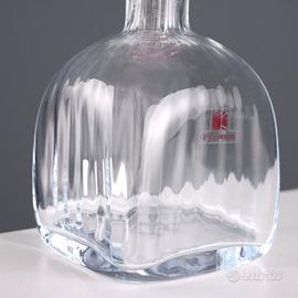 Bottiglia in vetro soffiato a costolature con tappo a forma di rosellina.
