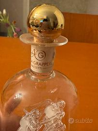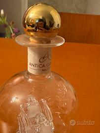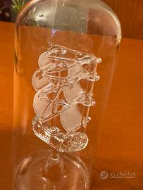 Elegante bottiglia in vetro trasparente con una dettagliata barca a vela in vetro soffiato all'interno. Il tappo dorato completa il design raffinato. Da collezione. - Design unico con barca a vela interna. - Tappo sferico dorato. Altezza 21 cm, larghezza 6 cm. (Box)