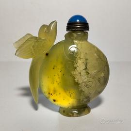 Bellissima bottiglia da fiuto cinese intagliata in un unico blocco di giada con inciso uccellino.