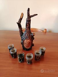 Bottiglia con 6 bicchierini da liquore ricoperti in legno usato, bicchierini con vetro un po' opaco