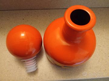 Bottiglia porta liquore arancione con motivi geometrici di colore giallo e nero,disegnata da Beccaro per Lacrima Christi.