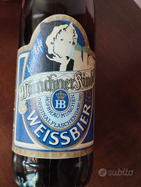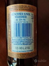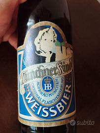 Bottiglia di birra Munchener Kindl Weissbier in vetro soffiato. Etichetta originale.