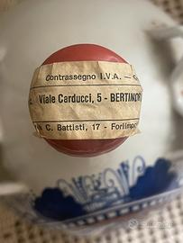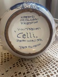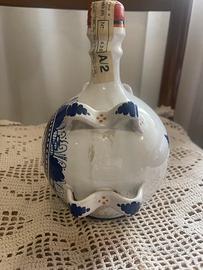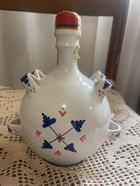 Si tratta di una bottiglia di vino in ceramica di Faenza, realizzata a mano e decorata con il tradizionale motivo del gallo, tipico della produzione maiolicara faentina. Presenta un tappo sigillato con ceralacca per preservarne il contenuto.