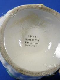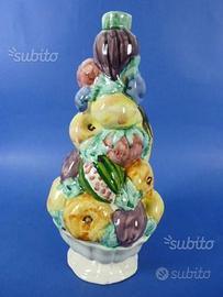 Simpatica ceramica dipinta rappresentante una cesta piena di frutta a formare una torre, che fungeva da bottiglia /contenitore per i vari liquori prodotti dalla nota casa mdi Torreglia (PD).