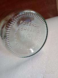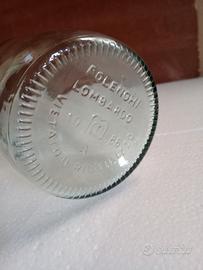 Bottiglia per latte Vintage vuota con scritte in rilievo che indicano il produttore e l'anno di produzione , su alcune foto è ripreso il fondo.