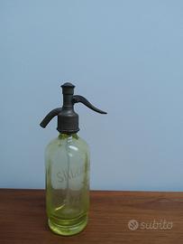 Bottiglia “Sifone” primi del ‘900 per acqua San Pellegrino. Acqua Seltzer per acqua frizzante sotto pressione dalle fonti di San Pellegrino Terme. La bottiglia è in vetro molato e sfaccettato e la valvola a rubinetto è in peltro con incisi i riferimenti al produttore (G.B.Monti, Milano e G. Albertazzi). Pezzo da collezione, non in uso, con provenienza certificata dalla scritta molata del Salon Eden di San Pellegrino Terme. Dimensioni: altezza totale: 26,5 cm; Diametro: 6,5 cm; Peso: kg. 1,150.