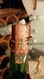 Bottiglia storica da collezione di maraschino 40% alc. vol. Luxardo Perla Dry anni 70 da 75 cl, il prodotto più prestigioso della gamma, caratterizzato un tenore di zucchero decisamente ridotto (da cui la dicitura “dry”), e da una base di distillato di marasche invecchiato oltre 50 anni, risalente agli anni 70 come desumibile anche dal contrassegno alcolico in carta filigranata rosa-arancio con due stelle e indicazione “da litri 0,750”. Etichetta originale e tappo integro