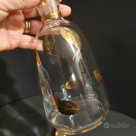 Da eredità, vendo antica bottiglia completa di tappo a goccia, risalente agli anni 30 utilizza per liquore / rosolio, impreziosita da una decorazione fatta a mano di foglioline d'oro molto elegante e nonostante gli anni ottimamente ben conservata (vedi tutti i dettagli evidenziati in foto) Per ulteriori informazioni e dettagli non esitate a contattarmi