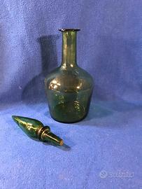 Vecchia bottiglia con tappo, decanter in vetro soffiato anni 50/60 di color verde per vino rosso, probabilmente vetro di Empoli, manifattura specializzata nella produzione di damigiane e bottiglie per il vino alt. Cm.24, con tappo cm.35 , base dia. 11,5.