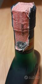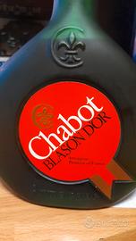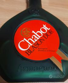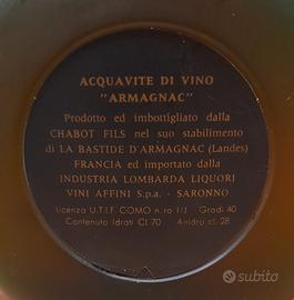 Bottiglia di Armagnac Chabot Blason d'or acquavite di vino Armagnac da 70 cl gradazione 40%, risalente agli anni 70 come dimostrato dal sigillo fiscale italiano d'epoca e dalle scritte sul retro etichetta, produttore Chabot Fils (La Bastide d'Armagnac, Francia), iconica bottiglia piatta con stemma "Fleur de lis" (giglio) in rilievo, importatore storico industria Lombarda Liquori Vino Affini spa (Saronno). Bottiglia sigillata con sigillo statale italiano d'epoca (Serie A), il livello del liquido è ottimo visibile attraverso il vetro satinato verde.