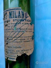 Vendo rarissima bottiglia storica vuota di Fernet Milano, Liquore Amaro Stomatico, risalente al periodo compreso tra gli anni '20 e gli anni '40 testimoniata dalla tipografia e dalla dicitura "Stomatico e riferimenti alle "proprietà tonico-calmanti. Sigillo Originale in vetro sul collo della bottiglia, con un simbolo a stella impresso. L'etichetta è originale e parzialmente danneggiata a causa del tempo e dell'umidità (come da foto), ma il nome del prodotto e le diciture sono ancora ben visibili e leggibili. Vetro di colore verde scuro con le imperfezioni tipiche della produzione d'epoca. La bottiglia è vuota. Altezza 34 cm. diametro 8 cm.