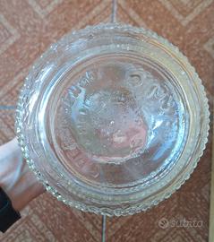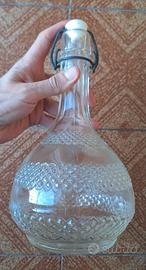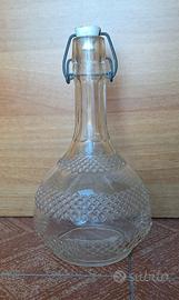 Elegante bottiglia vintage in vetro trasparente lavorato, con decorazione geometrica (a rombi) a rilievo. Ha una forma panciuta con collo lungo ed è dotata di tappo meccanico a leva (manca la guarnizione). Tappo color bianco. Perfetta come decanter per vino o liquori, bottiglia per olio o acqua, oppure come oggetto decorativo per cucina, taverna o arredamento vintage. Bottiglia vuota. Misure: altezza 25 cm circa, circonferenza massima 44cm circa, diametro base 9 cm circa. In buone condizioni generali, senza rotture evidenti. Normali segni del tempo. Scritta impressa: “Torino, Rebaudengo e figli”. Prezzo trattabile