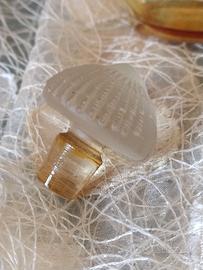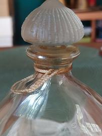 Bottiglia vuota di profumo Eau de toilette Shalimar di Guerlain, forma a goccia (goutte) tappo satinato a ventaglio di Lalique, c'è ancora il sigillo e il cordino originale attorno al collo della bottiglia. Shalimar è il primo profumo ambrato della storia, creato nel 1925. La bottiglia vuota è stata prodotta in collaborazione con Lalique e la rende oggetto di collezione. Altezza 17,5cm 250ml. La bottiglia è integra. L' articolo non contiene alcuna fragranza e viene venduto esclusivamente a scopo di collezione. C'è una leggera patina essicata sul fondo.