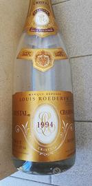 Vendo bottiglia vuota (senza tappo) di vino Champagne Louis Roederer Cristal del 1994, buone condizioni, normali segni del tempo, fondo con residui, vedere foto.