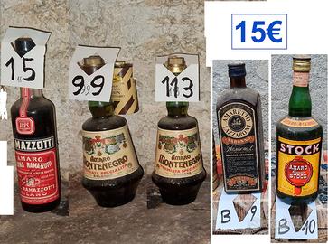 Vendo vecchie bottiglie da collezione. Ben tenute, condizioni come da foto. Sono disponibili le bottiglie elencate qua sotto: CAMPARI - Cordial Campari - 80€ CAMPARI - Cordial Campari +libretto - 90€ _____10€ a bottiglia_____ 59 - AMARO BOLS(2pz) 117 - AMARETTO DI SARONNO ORIGINALE 155 - AMARO MONIER / 40€ _____15€ a bottiglia_____ 15 - AMARO RAMAZZOTTI 1815 99 - AMARO MONTENEGRO PREMIATA SPECIALITA' 113 - AMARO MONTENEGRO PREMIATA SPECIALITA' B9 - AMARETTO LAZZARONI SARONNO B10 - STOCK AMARO BIANCO Spedizione disponibile / Per ordine minimo 40€ Astenersi perditempo, grazie.