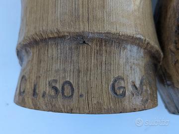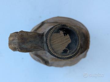 Bottiglie per liquore in finto legno. Entrambe sono vuote. Una rappresenta la testa di un Alpino e l'altra di un pirata. Altezza 23 cm.