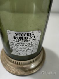 Due bottiglie vuote di vecchia Romagna brandy con guarniture in argento della ditta fratelli Galbiati di Milano molto rare