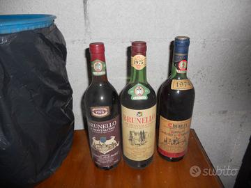 Bottiglie di vino 75 cl originali (BRUNELLO + CHIANTI) conservate in cantina. La vendita avviene per tutte le bottiglie e non per singolo pezzo. Non si spedisce. Luogo Velletri (RM). Nessuno sconto. Vista la delicatezza del prodotto si consegna a mano.