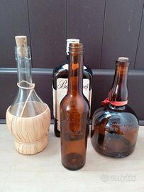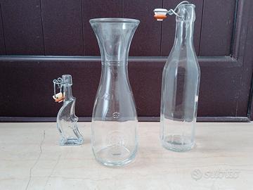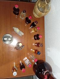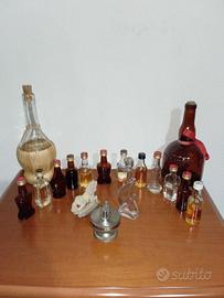 Vendo, in blocco, al prezzo complessivo indicato, diverse bottiglie particolari per epoca, foggia, utilizzo, compresa una misura da 1 Litro. Inoltre, sempre nel blocco, vendo alcune bottigliette mignon, alcune piene, alcune vuote. Inoltre, ancora compresi nel blocco, un accendino da tavolo e un cavalluccio statuina bomboniera. NB: il tappo di vetro della bottiglia al centro della prima foto si è rotto.