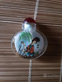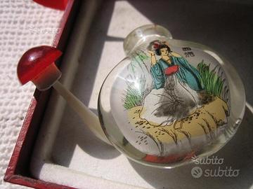 Particolare snuffe bottle, bottiglietta da tabacco da fiuto del'900,di vetro soffiato dipinta dall'interno,con scene diverse da ogni lato,completa del tappino a "cucchiaio" per fiutare il tabacco ,nuova,fondo negozio del '900,pezzo unico.Misura cm 5 di altezza.Oggetto particolare di cristallo dipinta dall interno,pezzo unico.Spedisco ovunque la consegna avviene tra le 24 ore e i 5 giorni secondo la formula che sceglierete.