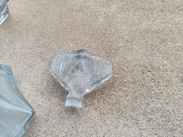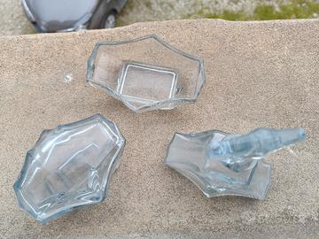 bottigliette art decò anni '900. in vetro, introvabili. unico difetto la punta del tappo spezzata ma inserita nella bottiglia non si nota