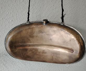 bouillotte d'epoca in ottone. È un modello noto come "bouillotte de cavalier cocher". Prodotta dal marchio "BP LYON". Veniva utilizzata storicamente anche per il contrabbando di alcol o altre merci.