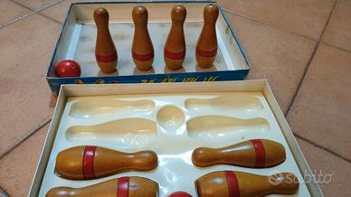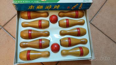 Gioco vintage con scatola originale anni 70. Bowling Ten- Pin. Dieci birilli e due palline in legno. Segni di usura sulla scatola(vedi foto)