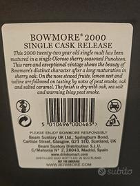 Questo single malt del 2000, invecchiato ventidue anni, è stato invecchiato in un Puncheon stagionato con sherry Oloroso. Questa rara ed eccezionale annata mostra la bellezza del carattere distintivo di Bowmore dopo una lunga maturazione in rovere Sherry. Al naso, frutta cotta, scorza di limone e iodio sono seguiti, all'assaggio, da note di fumo di torba, rovere e caramello salato. Il finale è secco, con rovere, sale marino e il caldo fumo di torba di Islay.