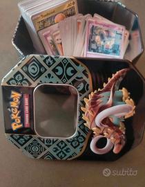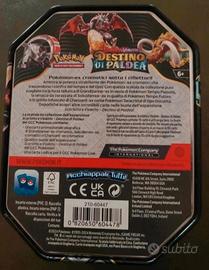 Scatola Pokemon in metallo Destino di Paldea + 40 carte Pokemon incluse serie miste di cui 10 carte tra Reverse e Holo. Box e carte in ottimo stato.