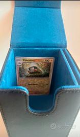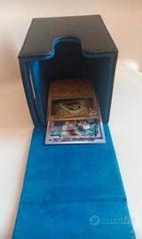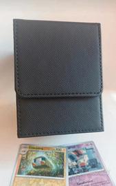 Box rigido portacarte Pokemon o simili in ecopelle nera interno floccato blu con chiusura a magnete Finesta laterale con toploader incluso per carta o numerazione serie contenuta. Internamente possono essere inserite carte in sleeve o carte in Toploader come in foto Dimensioni esterne mm 85x88x110 Prodotto nuovo. 1 Toploader incluso 25 carte carte Pokemon comuni holo, reverse no doppioni , in omaggio.