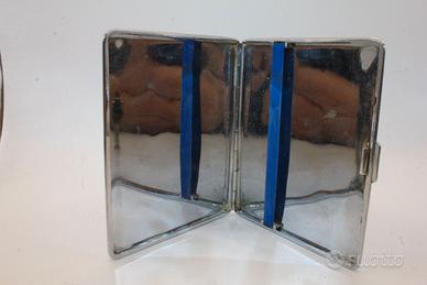 L'apertura a libro rivela un interno spazioso e funzionale, caratterizzato da una finitura lucida a specchio. Una fascia elastica di colore blu intenso è fissata tramite appositi ganci metallici per mantenere le sigarette perfettamente in posizione.