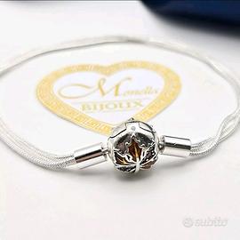 Nuovo modello di bracciale in argento 925 compatibile con tutti i tipi di charm compresi quelli Pandora. La chiusura del bracciale è una sfera con una foglia autunnale, decorata marrone con piccoli zirconi.