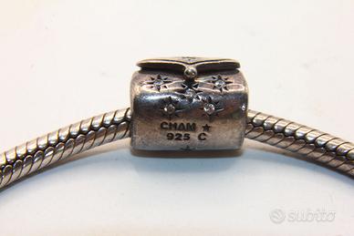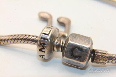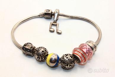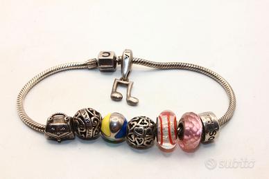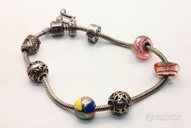 Bellissimo bracciale "Chamilia" in argento con chiusura a moschettone in stile serpente che monta una selezione di otto charms diversi per design e materiali i charms includono perline in argento lavorato a traforo e con decorazioni a rilievo una perlina in vetro colorato trasparente con glitter rosso all'interno e una perlina sfaccettata di vetro o cristallo rosa è presente anche una perlina in argento con smalto giallo e blu oltre a charms a forma di cubo con iscrizioni e una nota musicale pendente il bracciale e i charms sono realizzati in argento come suggerisce lo stile e la qualità e la loro combinazione crea un gioiello personale e colorato in ottime condizioni con una leggera patina che ne sottolinea l'autenticità e l'uso.