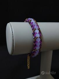 Questo bracciale artigianale è un raffinato esempio di maestria orafa contemporanea, realizzato interamente a mano con la meticolosa tecnica del bead weaving. Il design evoca il fascino intramontabile dello stile neo vittoriano revival, intrecciando gemme di agata lavorata finemente a perline Miyuki nelle calde tonalità del bronzo. Il gioco cromatico è esaltato da elementi in vetro viola e rosa che si fondono armoniosamente con cristalli viola dalla brillantezza magnetica. Completa l’opera una pratica chiusura con moschettone in ottone, dotata di una catenella che permette di regolarne la lunghezza per adattarsi perfettamente al polso. Un gioiello unico, ideale per chi cerca un’eleganza d’altri tempi con un tocco di luce moderna.