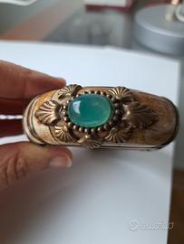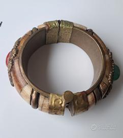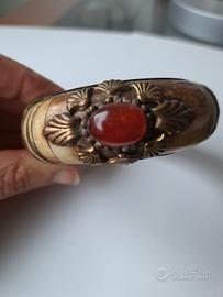 Bracciale rigido tribale in osso, ottone lavorato con pietre di corniola e giadaite. Chiusura a cerniera con perno a pressione