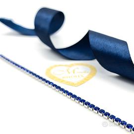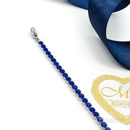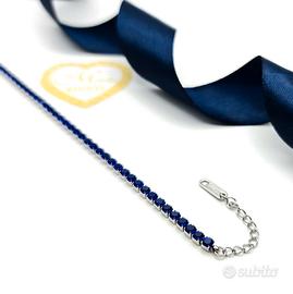Bellissimo bracciale tennis in acciaio, impreziosito da zirconi blu. Un gioiello elegante e raffinato, perfetto per ogni occasione.