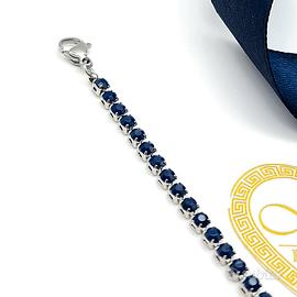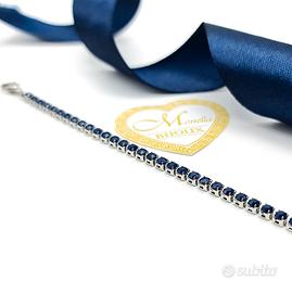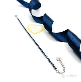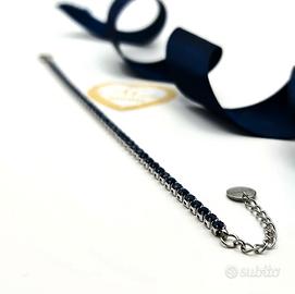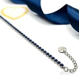 Bellissimo bracciale tennis in acciaio, impreziosito da zirconi blu. Un gioiello elegante e raffinato, perfetto per ogni occasione.