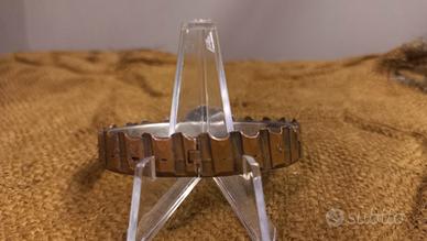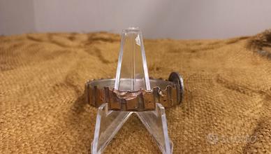 la moneta è saldamente tenuta da 2 punzone battuti mentre un terzo perno fa da chiusura a scatto, snodo a cerniera perfettamente modellato mentre l'interno è rifinito con artigiana sapienza da una lamina in acciaio per renderlo più comodo nell'indossarlo, un capolavoro da baraccamento di prima guerra mondiale se consideriamo i pochi attrezzi a disposizione.